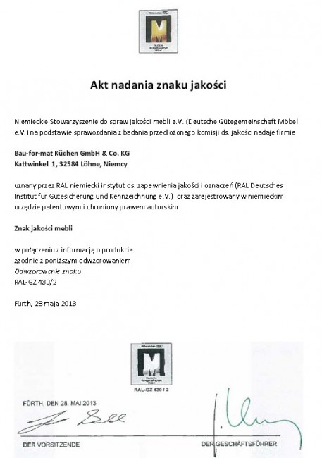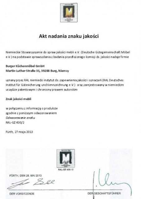 Cel firmy, jakim jest stałe dostarczanie najlepszej jakości, został dobitnie potwierdzony certyfikatem GS oraz najwyższym niemieckim certyfikatem jakości „ Goldene M „ / Złote M /.